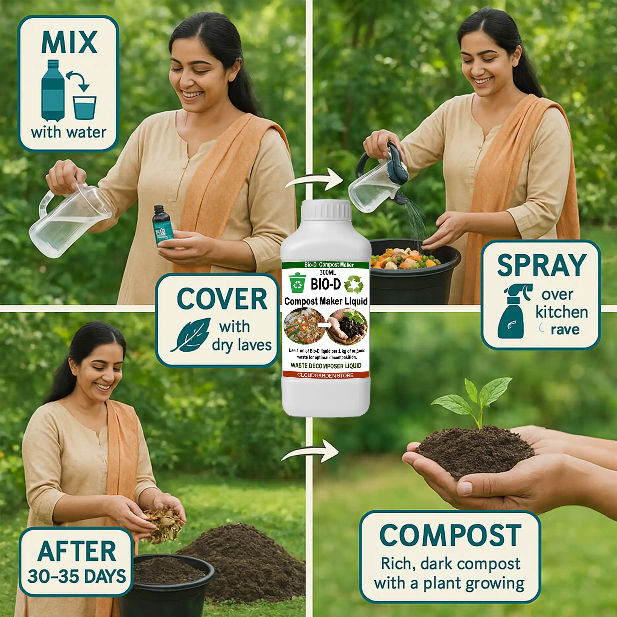 CloudGarden Bio-D Bacteria Waste Decomposer Liquid comes in a ready-to-use liquid form. For regular use, the recommended quantity can be mixed with water and applied evenly over organic waste. The liquid spreads easily across waste layers, helping maintain uniform moisture and better waste contact. This makes the product suitable for both beginners and experienced composting users.