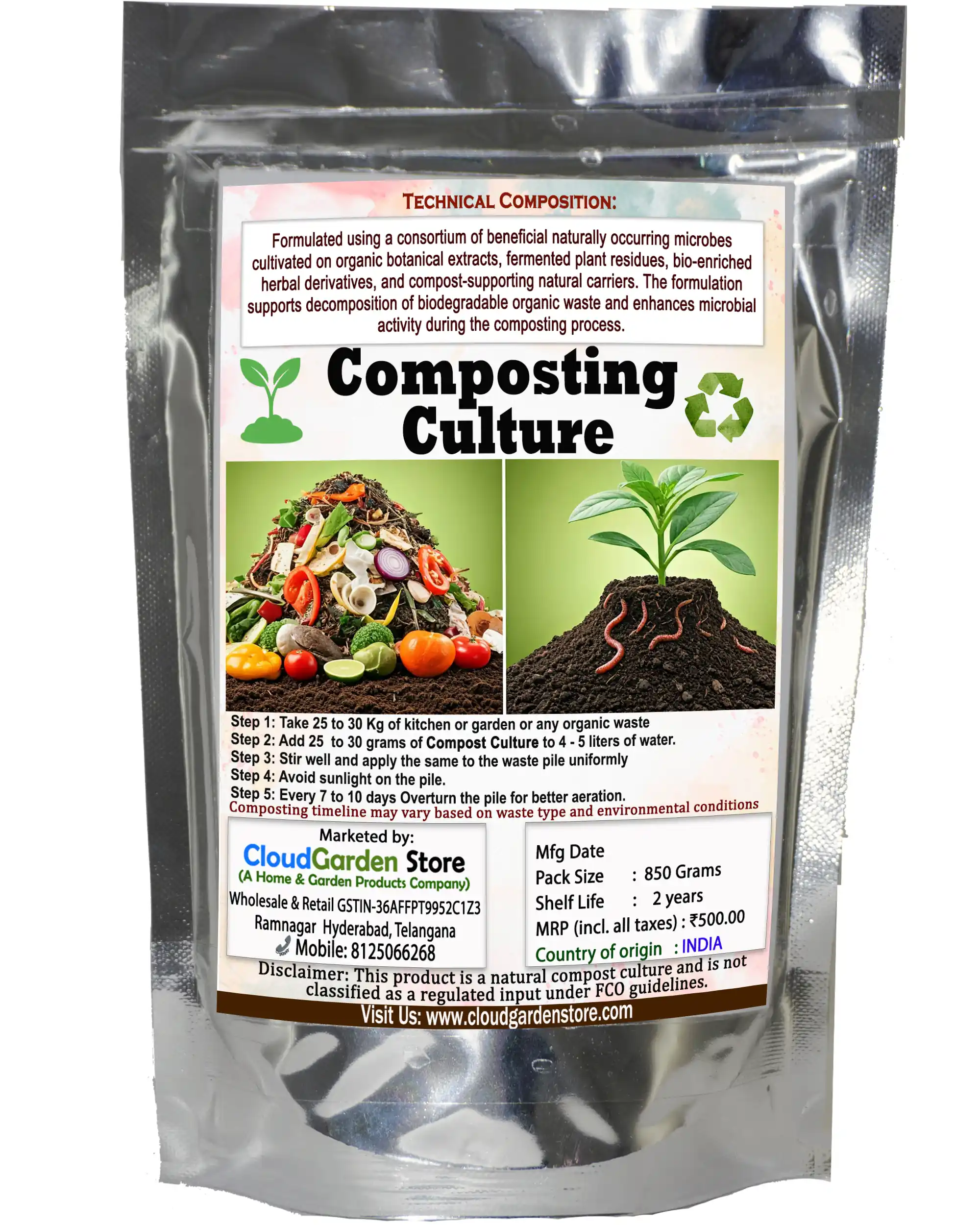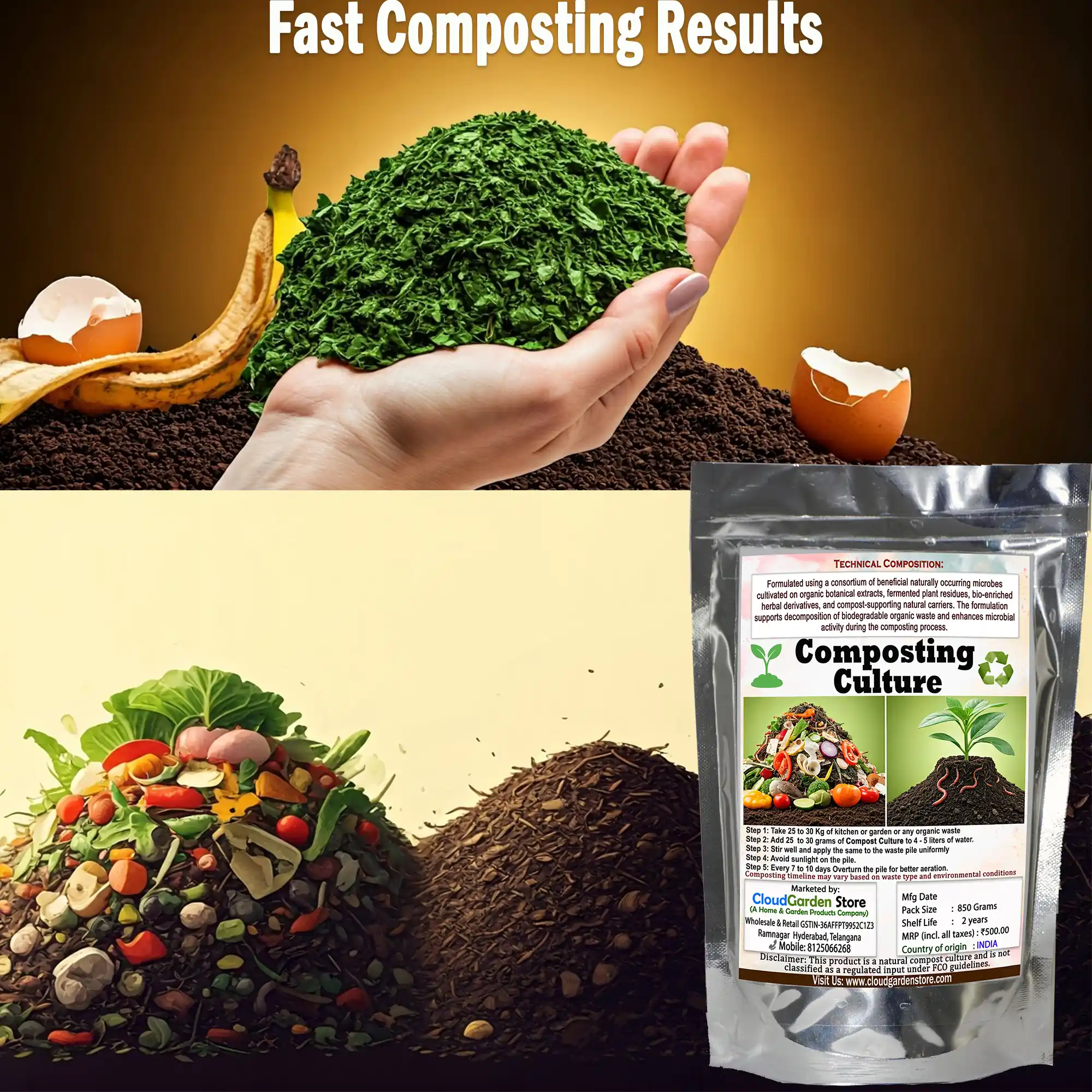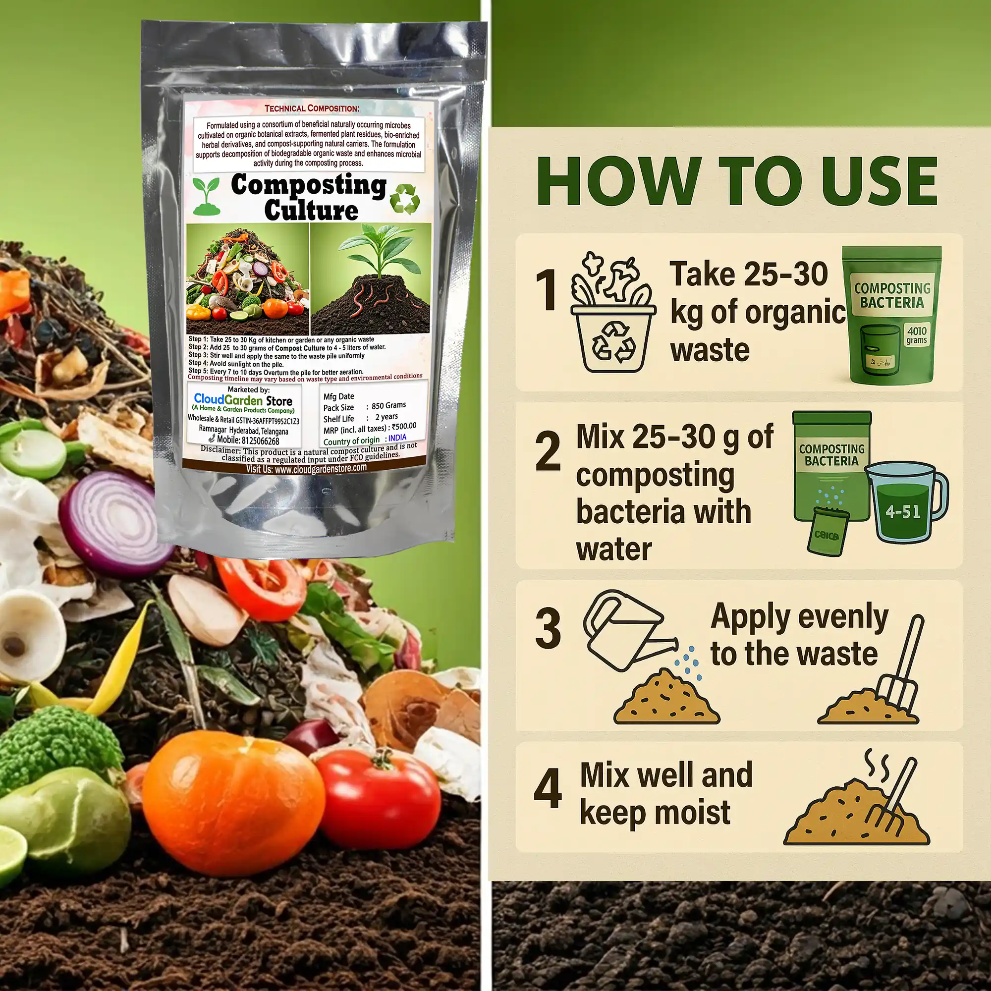 CloudGarden Composting Culture can be used across multiple composting setups, including household compost bins, terrace gardens, garden pits, and bulk organic waste composting systems. It is suitable for composting vegetable peels, fruit waste, dry leaves, garden trimmings, and farm residues under recommended conditions.