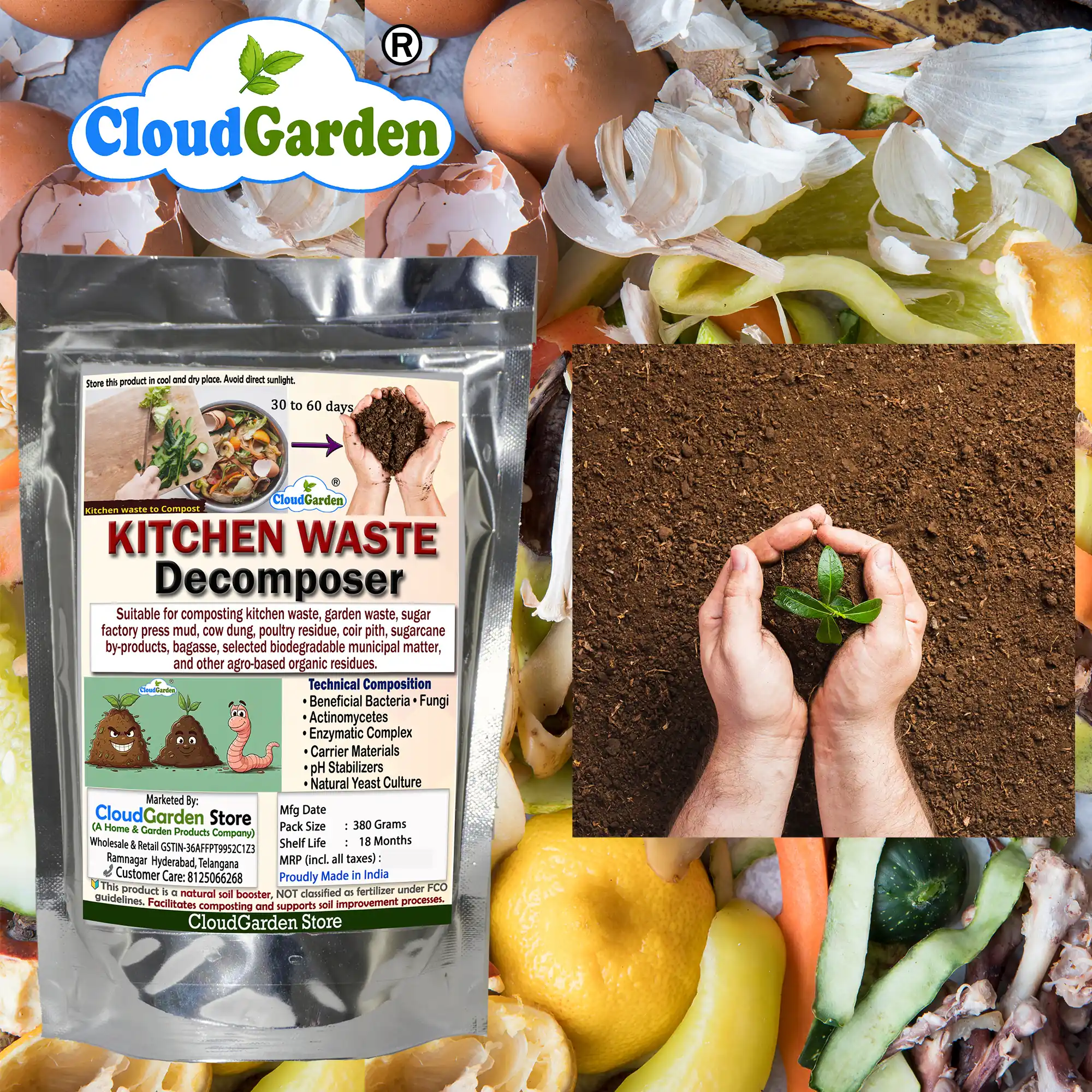 This product is intended for household kitchen and garden waste composting use only. It is not classified as a fertilizer, bio-fertilizer, pesticide, or plant nutrient under the Fertiliser Control Order (FCO).