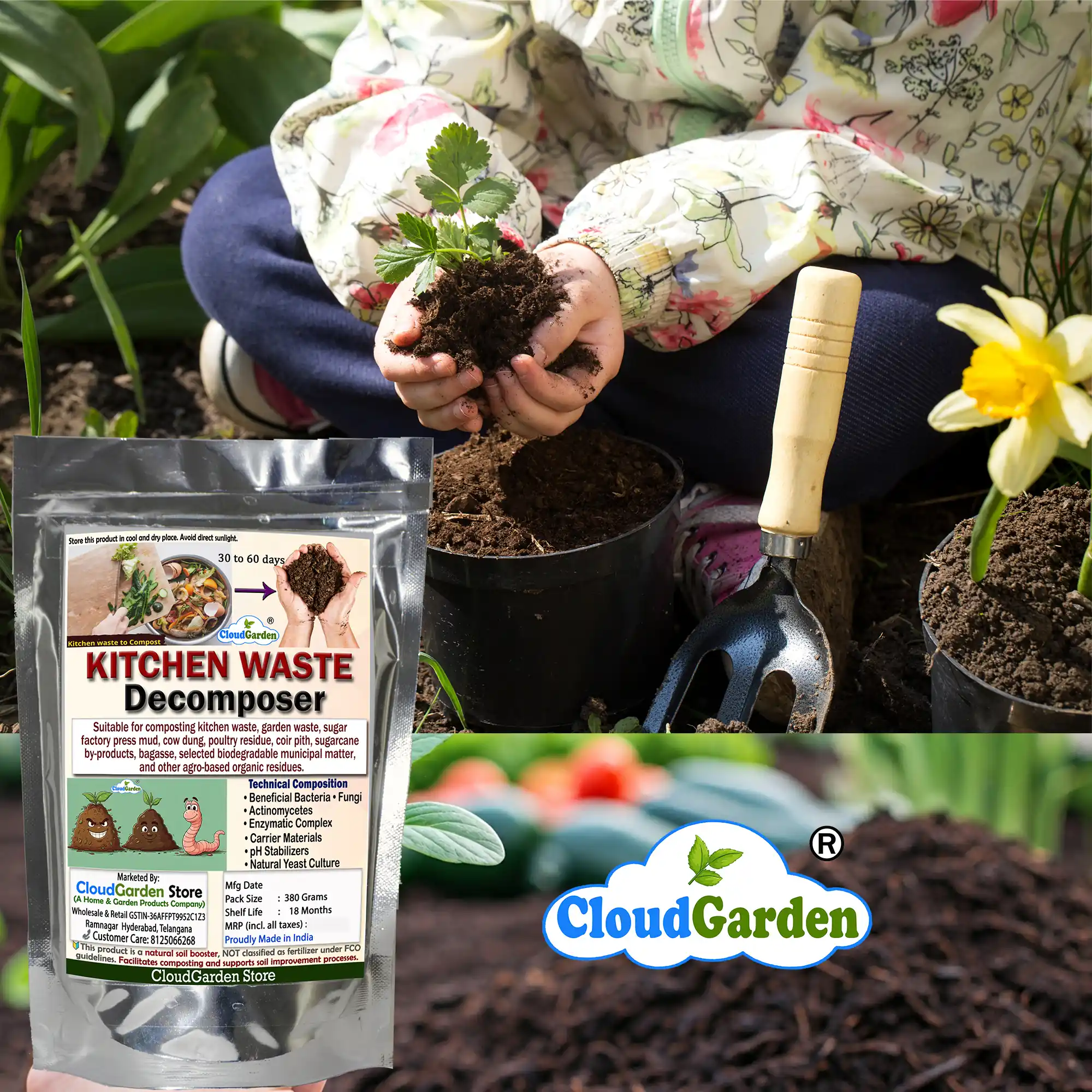 CloudGarden kitchen waste decomposer powder is a natural microbial culture designed to support composting of everyday food waste at home. It helps speed up the breakdown of kitchen waste and garden residues, making composting easier and more manageable for households.