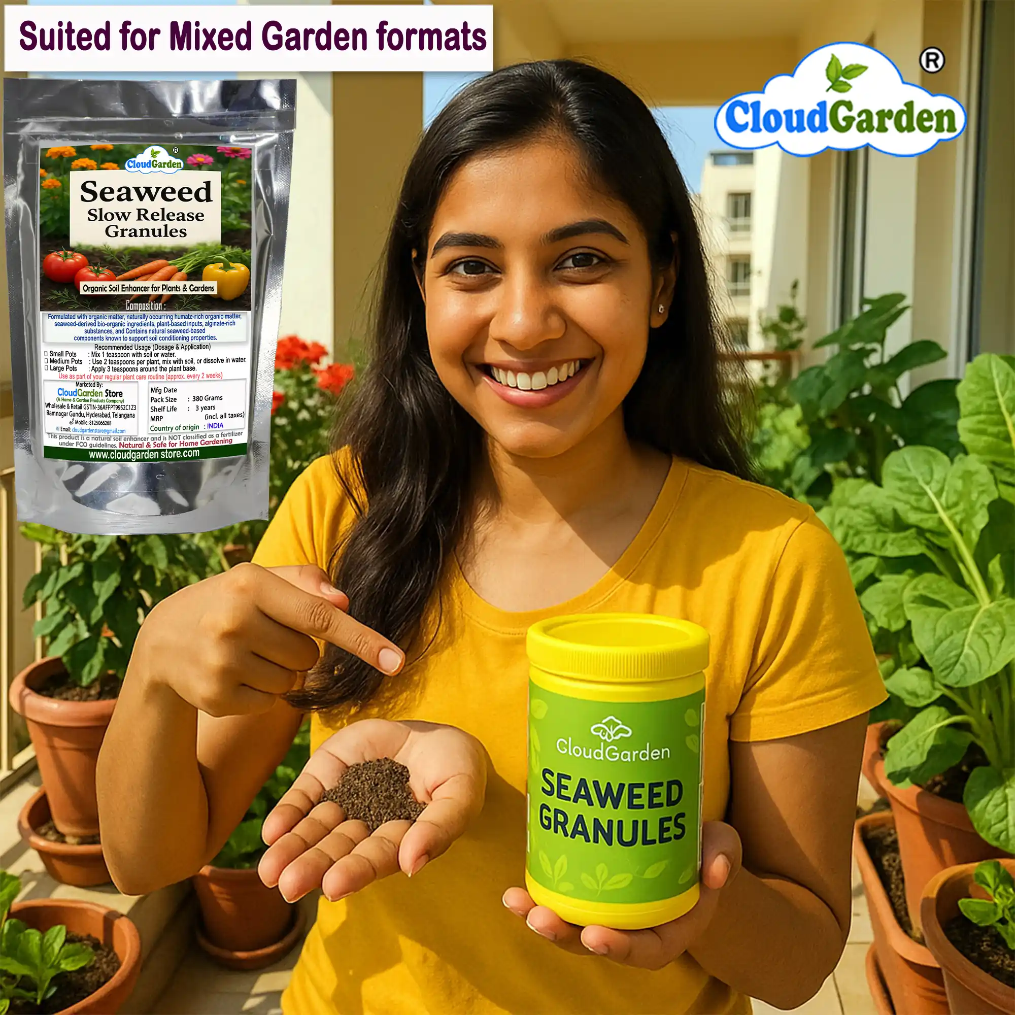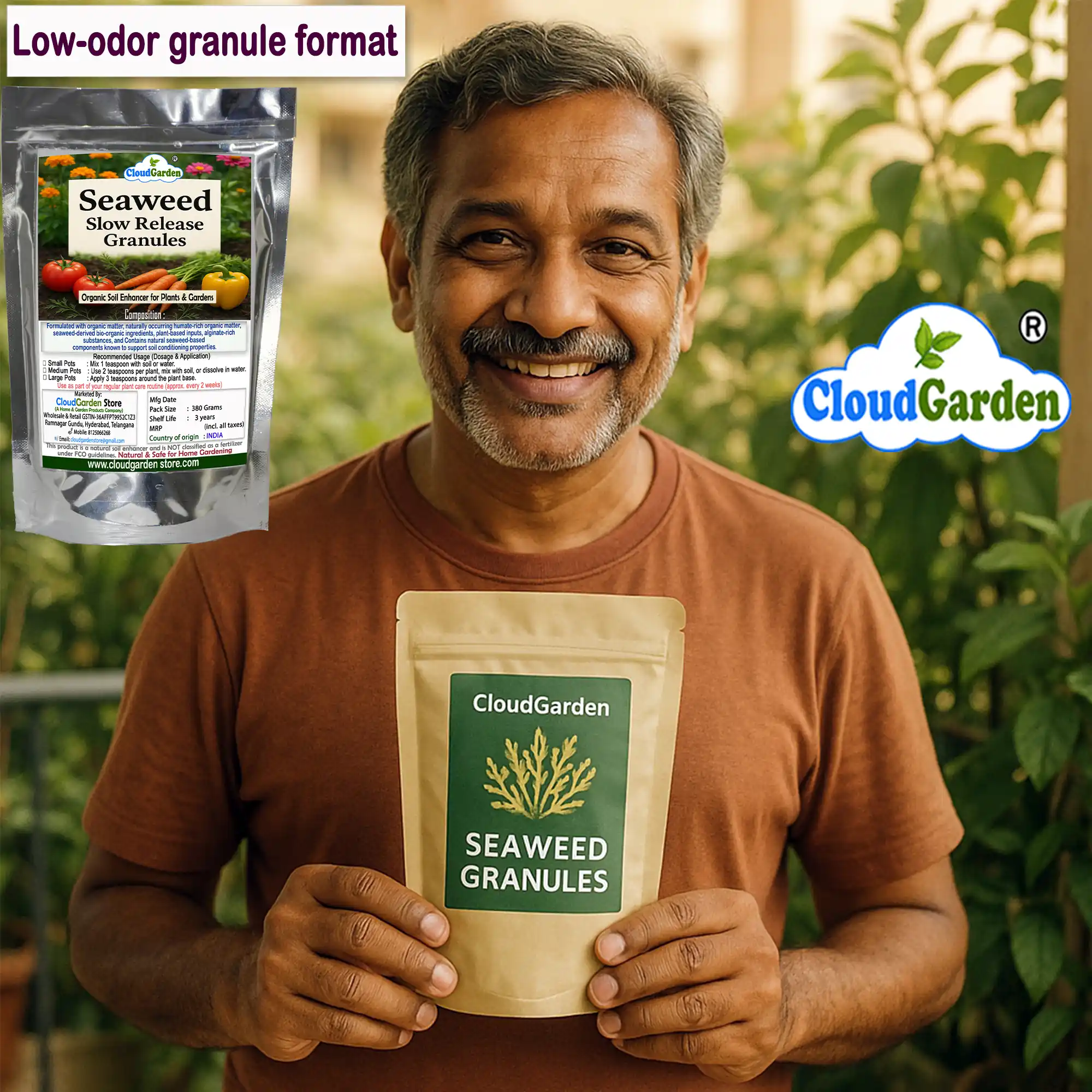 CloudGarden Seaweed Granules Soil Enhancer is designed to support healthy soil conditions for home gardening, balcony plants, terrace gardens, and potted plants. Made using seaweed-based bio-organic inputs and natural organic matter, this granule format is easy to handle, low in odor, and suitable for regular plant care routines.