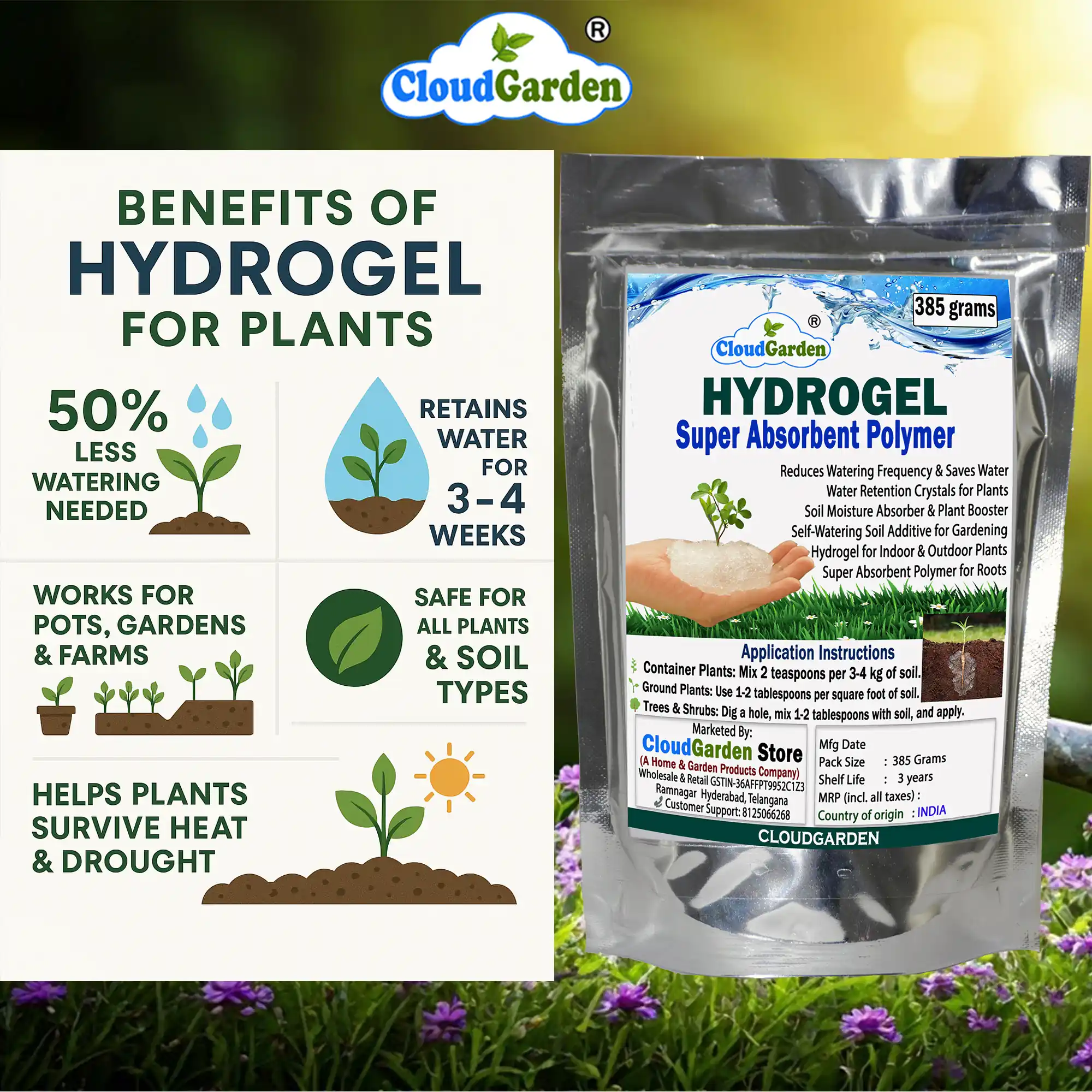 CloudGarden Soil Moisture Retaining Hydrogel Mega Pack 385g is suitable for a wide range of gardening uses. It can be used in potted plants, grow bags, terrace gardens, kitchen gardens, ornamental plants, lawns, and landscaping areas. It is also useful for tree planting and sapling transplantation, where maintaining soil moisture during early stages is important.